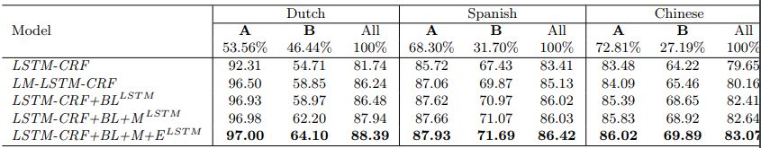 表 5: Comparison of the results for LSTM-CRF, LM-LSTM-CRF and our LSTM-based networks. A denotes the entities appearing in both training and test datasets, and B indicates all other cases. Evaluation metric is F measure