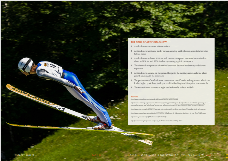 用人造雪来弥补天然降雪的不足举办冬奥会似乎是战胜了自然,但是在不远的将来,当日均温再升高 2.1°C 时,我们还是否能在冰雪世界里近期欢呼呢?人造雪也许是冬奥会未来答案的一部分,但它绝不是答案的全部。