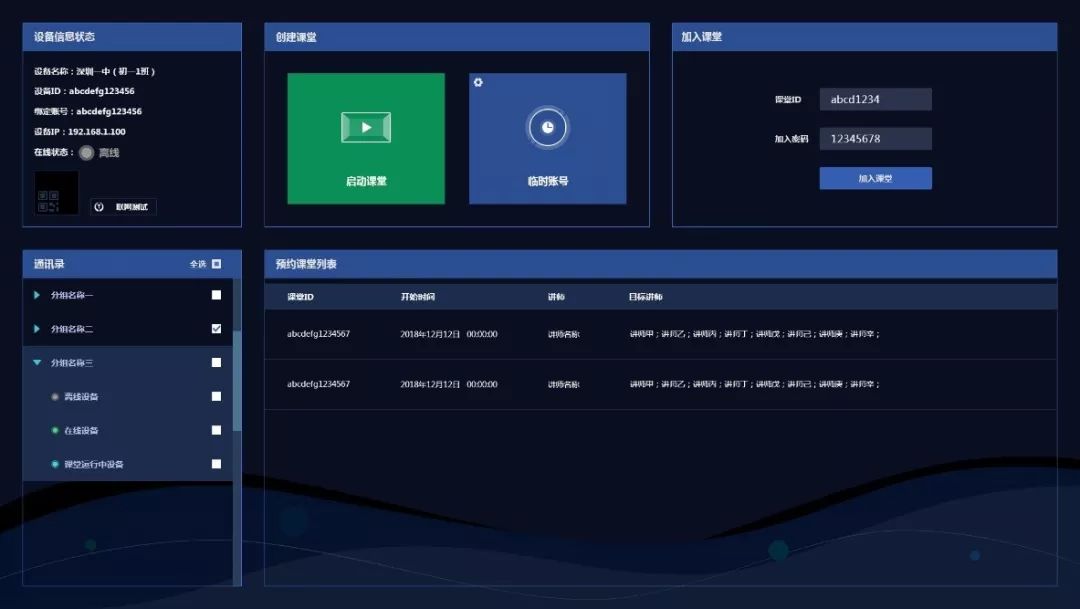如果有学生或班级中途需要加入课堂,输入帐号和密码就可以自主加入课程,不会对老师的教学产生影响。并且每次课堂的账号和密码都会随机更新,有效避免了课堂混乱。系统还可以提供名师课堂的提前预约,并且记录会维持24小时,在这期间课堂ID及密码都不会更新,方便听课成员随时加入。即便是在听课过程中出现断网断电情况也不用担心,在网络电源恢复后就可以加入之前的课堂继续听课。