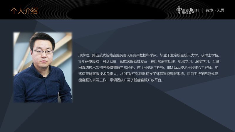 我在第四范式做智能客服的研发,毕业于北京航空航天大学,大约有 15 年左右的研发经验,涉猎的领域也比较广泛:有对话系统、智能客服、自然语言处理、机器学习等。我最早是在 IBM Jazz 技术平台上的工程师,后来去了环信做智能客服的负责人,曾经带领团队研发了环信的智能客服系统。目前我在第四范式主持智能客服的研发工作,带领团队研发了智能客服开放平台。