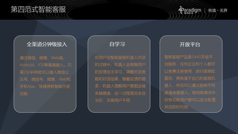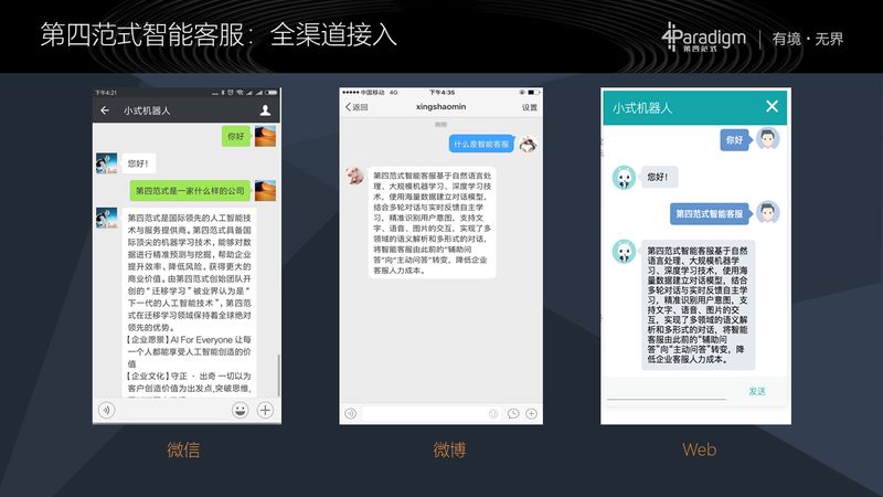 第一个特点就是针对之前讲的,客户觉得接入门槛高的问题,我们全渠道都是分钟级接入,现有的渠道(APP、微信公众号、Web 端、微博等),以及未来的一些渠道都可以在几分钟之内快速接入,就是让用户快速的拥有智能的能力;