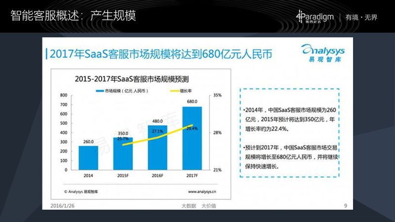 这是一个第三方在 2016 年做的 2017 年 SaaS 客服的一个市场规模预测,它预测 2017 年 SaaS 客服的市场规模将达到 680 亿人民币。SaaS 客服只是客服中一种,除了 SaaS 客服之外还有企业自建的客服,还有私有部署的客服等等。假如说智能客服可以解决 30% 的客服的问题,这还只是一个非常保守的估计,智能客服的市场规模也是非常大的。