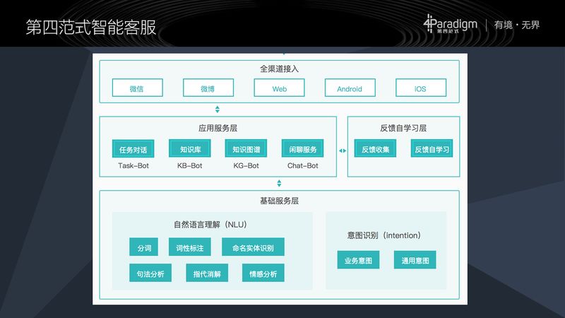 再往上就是四个功能模块:任务对话、知识库、知识图谱,还有聊天机器人。在这之上是全渠道低门槛接入,我们现有五个渠道,后面还会扩展更多的渠道,是一个真正的全渠道接入的智能客服。