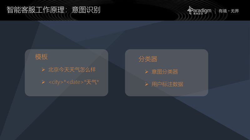 那么意图识别一般是怎么实现的?就是有模板和分类器两种方式。模板的方式,比如说:“北京今天天气怎么样?”我们会建一个叫“city”的词典,这里面会有北京、上海、天津等城市;我们会把今天、明天、后天等等也做一个词典,词典名字叫做“date”。这样如果满足刚开始有一个“city”,中间有任意字符串,然后再有一个“date”,然后再有“天气”这个词,就满足了一个模板,那么我们基本上可以认为它是一个询问天气怎么样的意图,这是模板的方法。
