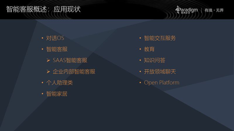 不过到现在为止,整个智能客服系统的发展非常快,应用也划分了很多的细分领域。这个不一定是一个完全准确的分类,只是说从我个人角度来讲,它可能是大致能分为这么几类。