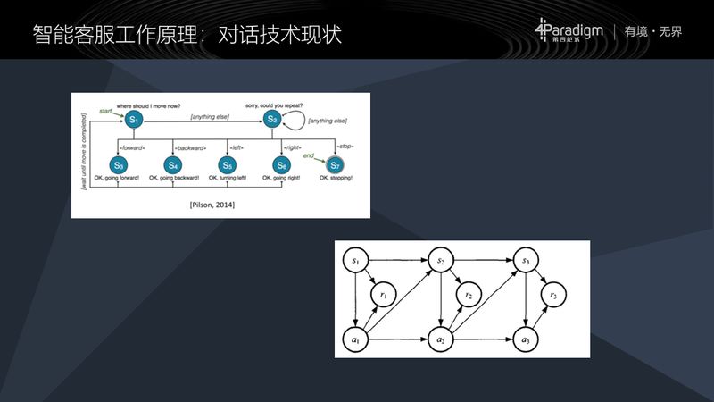 第二大类就是马可夫决策过程(Markov Decision Process, MDP)的方式,它和状态机的区别在于它里面增加了动作,状态机里面的动作是我们事先约定好的,是固定的动作,已经事先知道对话到了那时候,于是就固定的采取这样的动作,但是 MDP 这种方式,状态不确定,动作也不确定,所以说我的状态和动作是需要根据我的上一个状态和将要采用的动作做了以后的回馈(Reward)来进行决策的,所以说这个决策过程在特定领域里有足够的语料的时候可以做出很好的效果,但是我们得想办法去找到合适的领域,以及找到足够的语料才能做这样的事情。