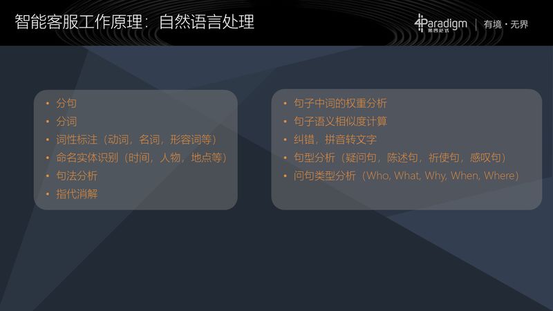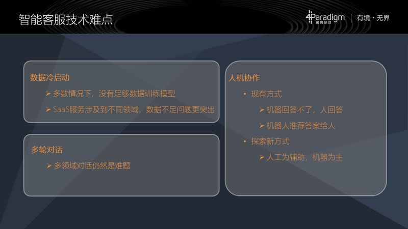 第四部分分享一下第四范式在智能客服的研发过程中所做的一些工作,以及遇到的一些问题,我们的技术特点,产品特点,研发现状和未来的方向等。