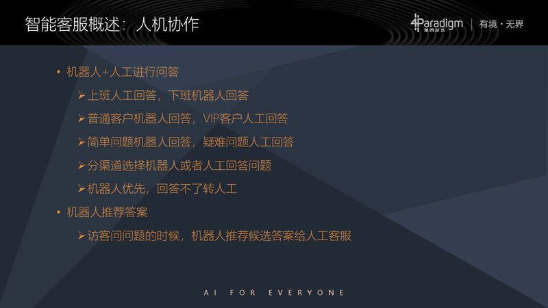 那么机器人和人工如何进行协作呢?我们这里举几个例子:比如说上班的时候人工来回答,下班的时候机器人来回答;普通的客户机器人来回答,VIP 客户人工来回答;或者是说分渠道来选择,比如说微信渠道来的机器人回答,手机渠道来的人工回答;还有就是机器人优先,机器人答不出来,转给人工回答。