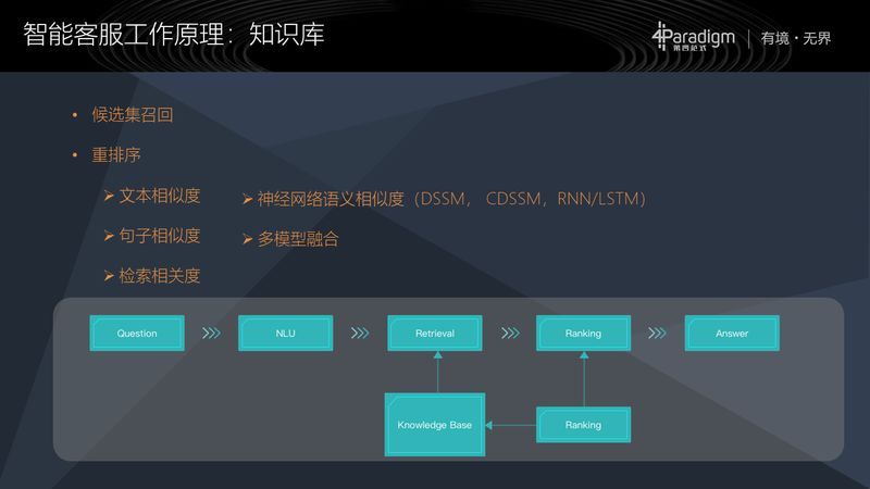 第二是重排序,其实我们可以用文本相似度、检索相关度,如果有足够数据的话,还可以用神经网络的语义相似度等,来做重排序工作。这些工作也可以用多模型融合的方式来做,将多个模型的结果综合考虑得到最终结果。这些都跟搜索引擎的技术没有特别本质的区别,也会有些微小的差别,这是知识库这块的工作。