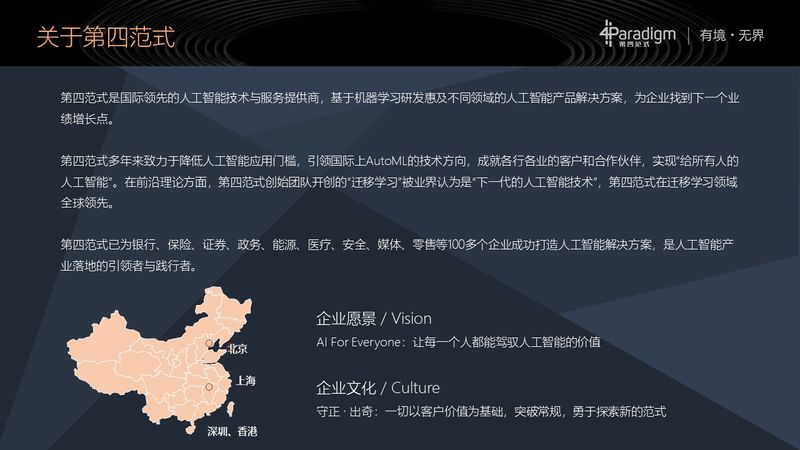 我是来自第四范式的邢少敏,首先允许我花一点时间介绍一下第四范式是一家什么样的公司。第四范式是一家人工智能技术与服务的提供商,主要是基于机器学习为企业找到一些业绩的增长点,已经为银行、保险、互联网等领域上百多家企业打造了人工智能产品及解决方案。