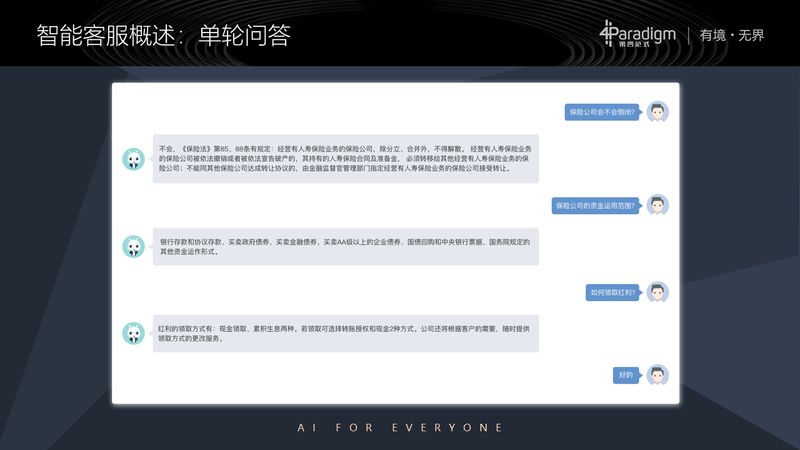 那么为什么我们要做这样一个免费的开放平台呢?第四范式的企业愿景是把 AI 的能力赋能给企业客户甚至是个人。因此我们希望做一个开放平台,允许企业的开发者、甚至是第三方的厂商,在这个已经很成熟的基础的技术平台上,做出自己企业需要的智能客服系统,或者做出自己细分领域的解决方案,只有这样,智能客服这个市场需求量极大的技术才能真正遍地开花。