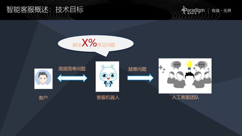 一般情况下,一个智能客服的目标就是我们这张图里描述的这些:一个客服的机器人负责回答客户的一些高频简单问题,将疑难问题交给人工客服团队来回答。那这个一定比例是多大比例呢?我这边写了一个百分之 X,也就是说这个比例不太确定,它是根据不同的场景以及不同的技术条件,不同厂商的技术能力而不同的,有的厂商是 80%,有的是 90%,有的甚至 95%,这都是不确定的。