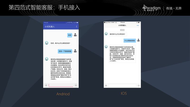 下面两张图分别是安卓的手机接入和 IOS 的手机,因为安卓和 IOS 采用的是 SDK。它最典型的场景是集成完以后,在这个手机 APP 上点一个类似于“联系客服”这样一个按钮,就会出现下图中这样的一个聊天窗口,用户就可以和机器人对话。