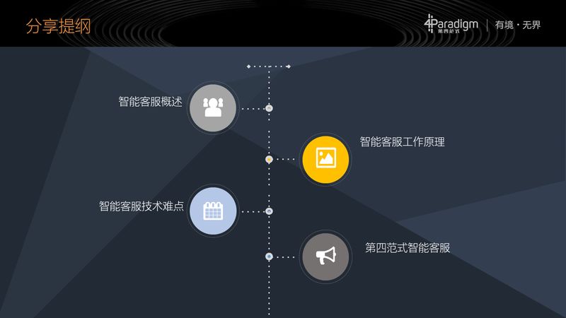 今天分享的提纲主要是分为四个部分,希望通过分享我在智能客服领域的经验,对各位开发者对理解和应用这个技术有一定帮助。