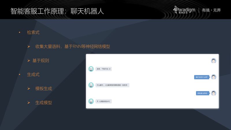 第四类是聊天机器人的技术,聊天并不是客服的首要功能,客服主要是解决问题的,不是来聊天的,为什么在一个智能客服系统里面会有聊天这么一个功能呢?原因在于,一是在用户没有输入知识库内容的时候,这个聊天机器人会被客户当成是测试厂商机器人技术能力的评测对象;二是在某些场景下,会让整个客服对话没那么单调。在实际的智能客服系统里面,一般也可以选择让用户可以关闭聊天功能。