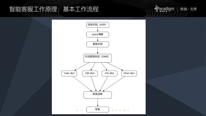 如果没有语音识别模块,直接就是文字,会首先对这个文字做一个问句的理解,或者说做一个查询的理解,理解完以后,再对意图做一个识别;最后,我们把这个问句的理解和意图识别的结果带到对话管理系统里边,对话管理系统会决定到底是给哪一种机器人发过去,这些机器人最后给出答案,将答案返回。