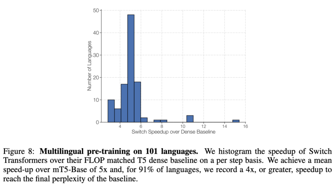 下图 8 展示了 Switch Transformer 相较 mT5-Base 的每一步加速情况,前者实现了平均 5 倍的加速,其中在 91% 的语言上实现了至少 4 倍加速。这表明 Switch Transformer 是高效的多任务和多语言学习器。