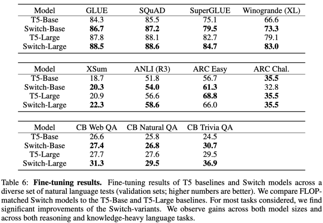 整体而言,Switch Transformer 模型在多项推理和知识任务中带来了显著性能提升。