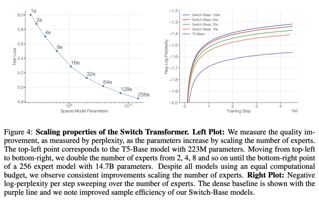 下图 4 展示了多个模型在训练步数恒定、专家数量增加时表现出的可扩展性提升情况。从中可以观察到一个趋势:在保持每个 token 的 FLOPS 不变时,拥有更多的参数(专家)可以提高训练速度。