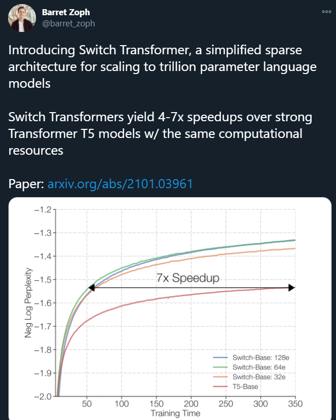 刚刚,Google Brain 高级研究科学家 Barret Zoph 发帖表示,他们设计了一个名叫「Switch Transformer」的简化稀疏架构,可以将语言模型的参数量扩展至 1.6 万亿(GPT-3 是 1750 亿)。在计算资源相同的情况下,Switch Transformer 的训练速度可以达到 T5 模型的 4-7 倍。