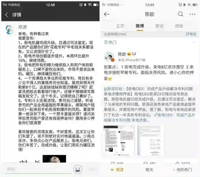 陈欧也在微博帐号上转发了新浪科技关于此事的报道,并写道“划重点: 1.街电完成升级,来电 8 亿讹诈落空 2.来电涉侵权苹果专利,面临关停风险,请小心你的押金”。