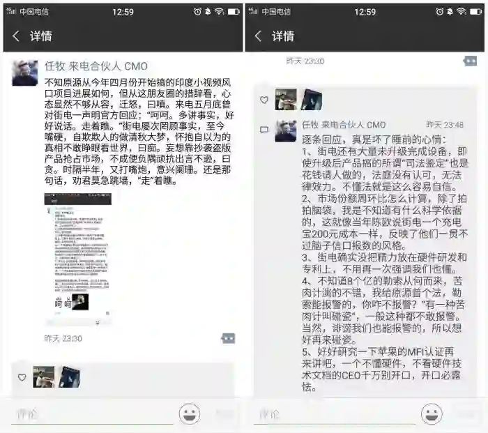 在原源发声之后,来电 CMO 任牧也在朋友圈逐条回应: