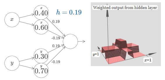 具备 4 个隐藏单元的简单神经网络逼近塔型函数。(图源:http://neuralnetworksanddeeplearning.com/chap4.html)