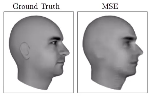 这种均化效应在许多实例中会导致非常糟糕的结果。以预测视频下一帧任务为例,下一帧的可能性非常多,你想要的是能输出「其中某一帧」的模型。但是,如果采用 L2 或 L1 训练模型,模型将平均所有可能结果,生成一张十分模糊的均化图像。