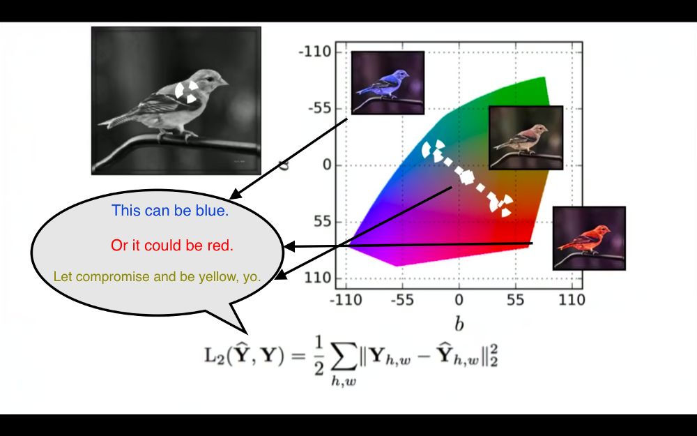 基于 L2 损失函数的反馈,模型已学习出一只相似的鸟,但模型应该输出一种与红色及蓝色都接近的颜色。模型会怎么做?