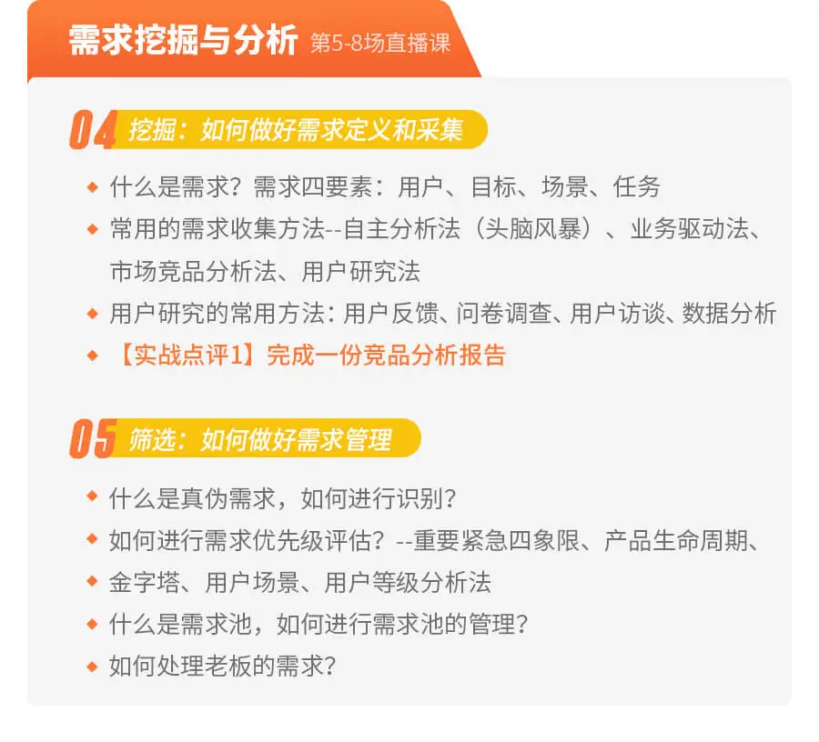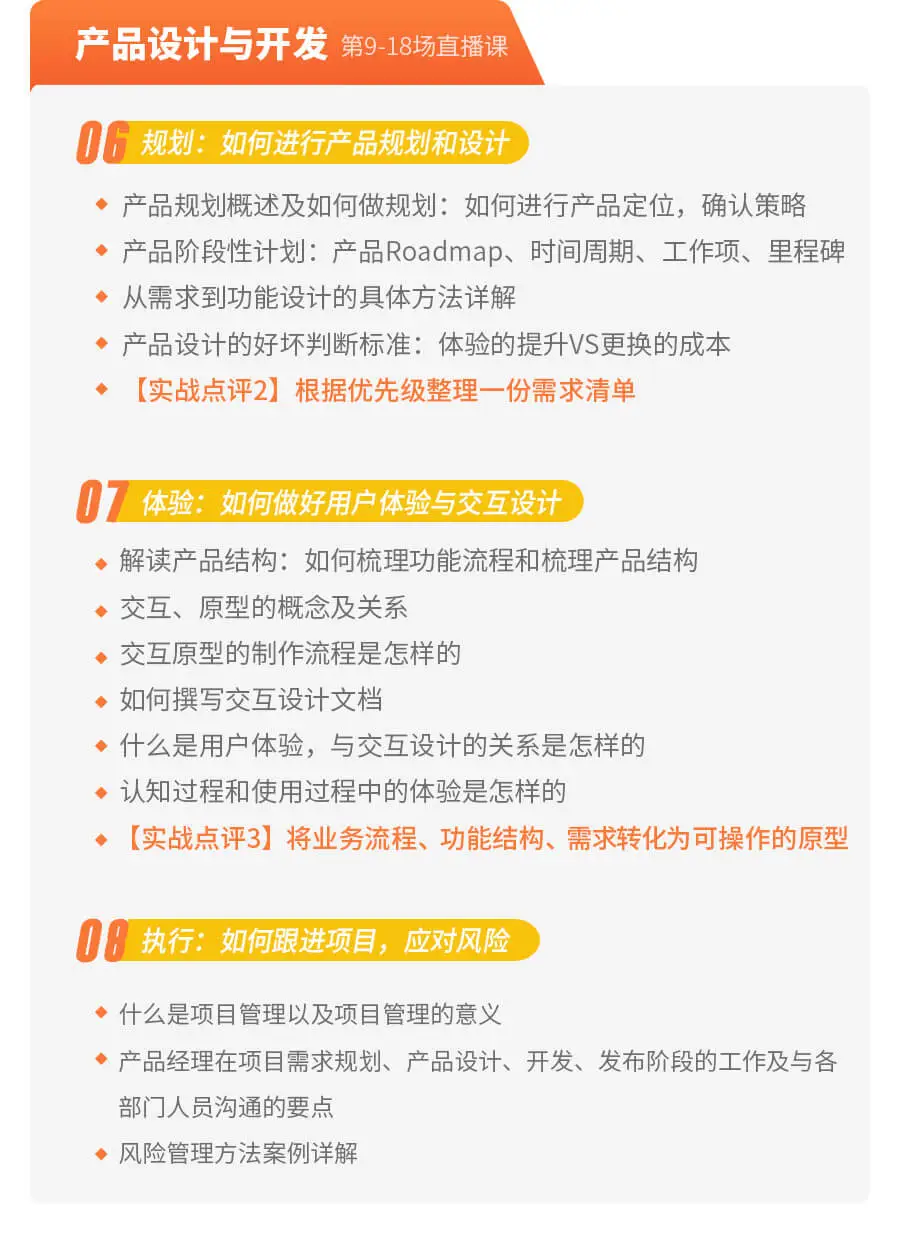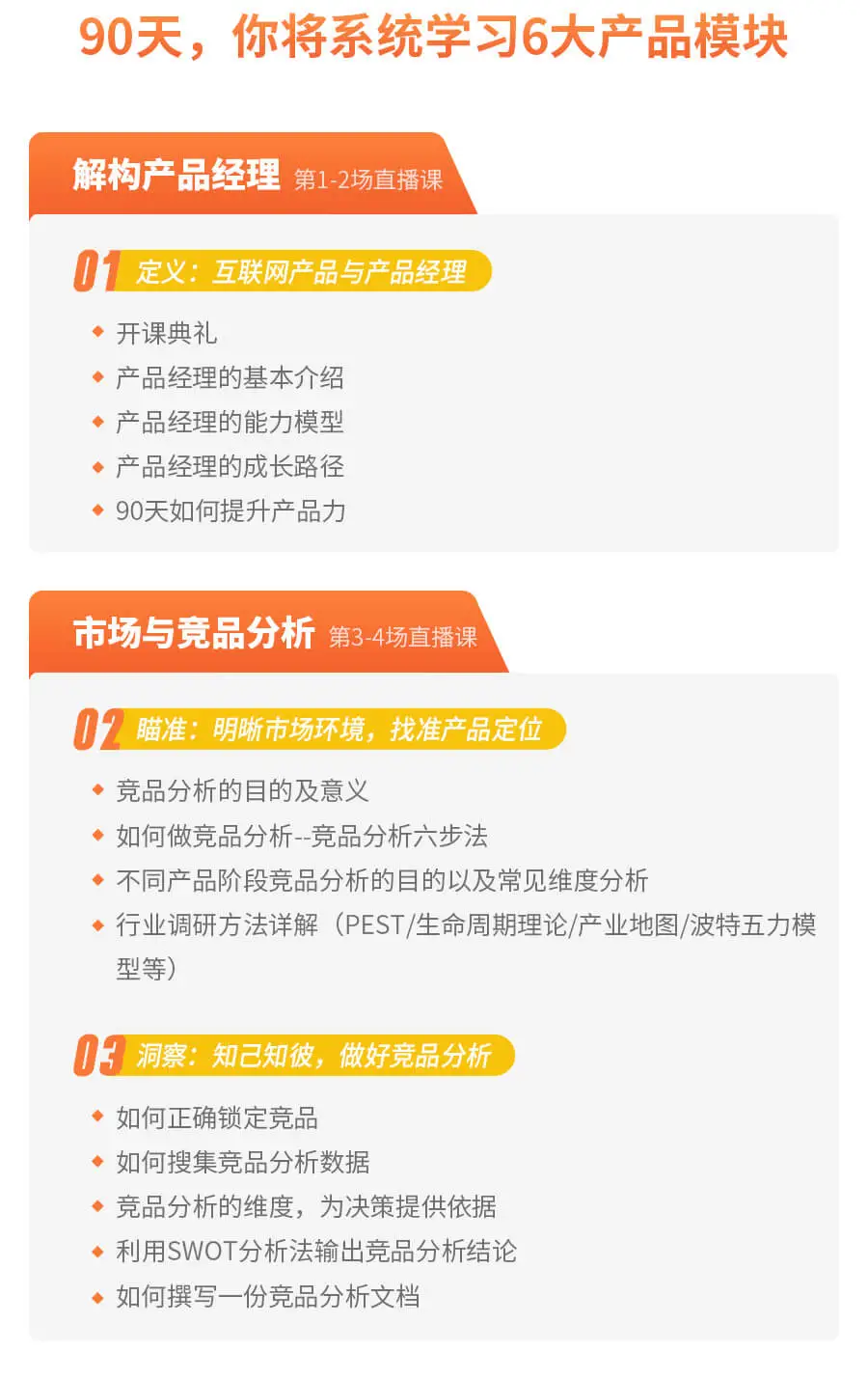 课程以6个产品知识核心作为主体,它们分别是:解构产品经理、行业与竞品分析、需求挖掘与分析、设计开发与项目执行、产品运营、产品进阶与就业指导。