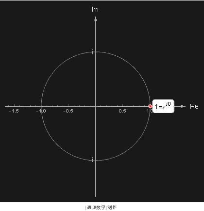 我们可以很快用几何的方法来证明该等式, 观察下图不同的 θ 值对应的极坐标 e^θ, 请留意动画停顿之处(特别是在复平面旋转角度为 180°, 点落到等于 -1 的时刻), 相信就会理解上面的欧拉等式: