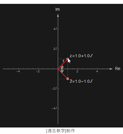 复数的模就是它长度 r: 从原点到 z 点之间的距离. 辐角 φ 就是与实轴的夹角, 共轭就是 a-b i 的形式. 观察下图可以更好理解: