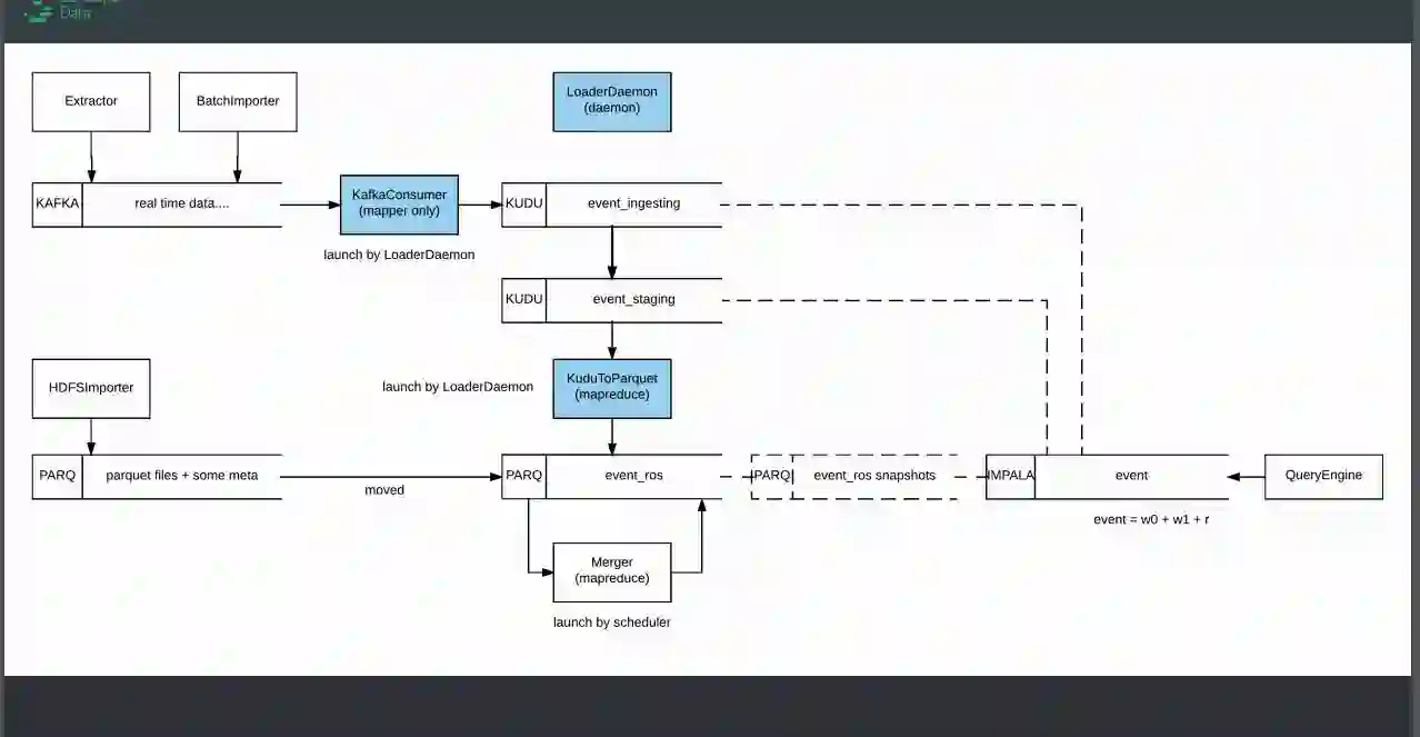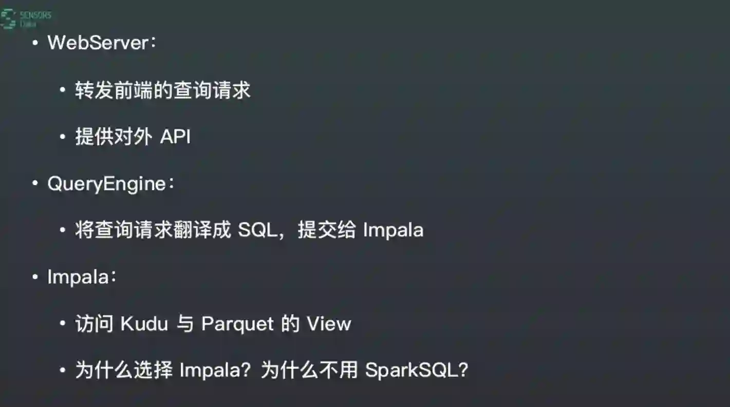 我们跟用户打交道的一个模块是WebServer,它是用来转发前端查询请求的,会接收客户通过我们前端发送过来的查询请求。当然,前端也提供了相应的 API,以满足客户的二次开发需求。WebServer会把这个查询请求转发给QueryEngine,后者会将查询请求翻译成SQL提交给Impala。Impala是一个目前很流行的 MPP 架构的分布式计算系统。前面我们提到,数据是存储在Kudu和Parquet两个存储体系里面,所以在这里我们将他们构建了一个视图,让Impala直接在这个视图上面进行查询,然后把查询的结果返回给前端。