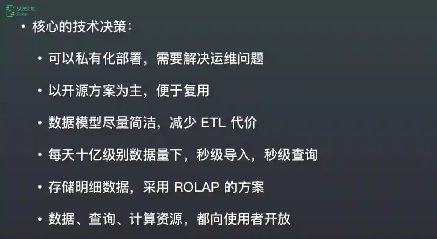 我们目前有了如下的一些核心的技术决策,首先我们的产品要能私有化部署,并且花了很大的代价来解决运维的问题;其次,我们要做一个全开放的PaaS 平台,以开源技术为主,便于用户做二次开发;第三,我们要能够保证在十亿数据量下秒级导入、秒级查询的时效性。因此,我们最终没有选择预先聚合数据,而是存储明细数据,也就是说存储一条条最明细的数据,在 MOLAP 与 ROLAP 的抉择之间,我们选择了ROLAP的方案。