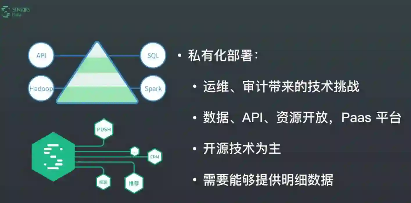 首先我们做设计和开发的时候,需要考虑因为私有部署所带来的对运维、部署和设计的技术挑战,我们整个开发过程中,有至少三分之一的精力花在解决私有化部署带来的这些技术挑战上;另外一个方面,做整个产品架构设计的时候,就要考虑数据、API、计算和存储资源的开放,要让每个环节都能开放出去给用户使用;第三点,则是让我们决定整个架构以开源技术为主,如果选择一些非常冷门的技术,可能别人在这个基础上做二次开发是一个很难的事情;第四点则是为了满足客户的积累数据资产的需求,我们需要能够向用户提供明细数据,提供最细力度数据,这也是最终决定我们存储选型的一个关键性因素。