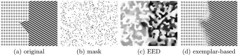 传统上,图像修复可以使用基于扩散方法来处理,这种方法将局部结构传播到位置部分,或者基于示例的方法,每一次构建缺失部分的一个像素点(块)同时保持和周围像素点的一致性。