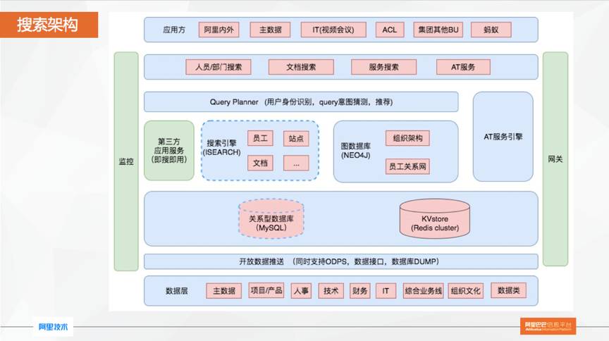 中间一层为搜索引擎,这是基于阿里巴巴自研ISEARCH做员工、文档、站点的搜索引擎;同时运用图数据库NEO4J来实现组织架构树,以及员工亲密度、关系网的建设。最上层则是Query意图识别与一些应用场景。