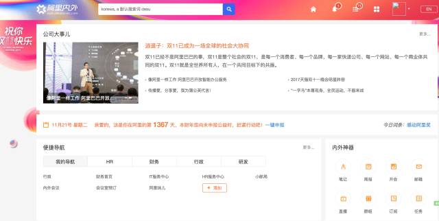 阿里内外是阿里内部员工使用的企业运行与协作平台。它诞生于2013年,彼时只是一个门户和企业社交的入口。但经过3年发展,阿里内外实现了平台化运营,不仅接入众多阿里应用与系统,阿里的生态公司也开始享受阿里内外提供的一体化服务。今年,阿里内外开始向3.0智能模式发展,通过互联网数据和算法技术,增加诸如企业搜索、企业推荐、智能工作辅助,通过智能模式提高员工协同办公效率。