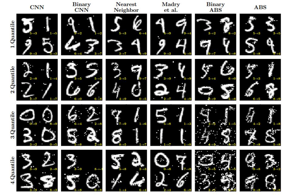 图 5:L_0 误差分位数:我们以前总是为每个模型选择任意攻击的最小化 L_0 对抗扰动。为了进行无偏差选取,我们随机地在四个误差分位数(0 − 25%、25 − 50%、50 − 75%、75 − 100%))中采样图像。