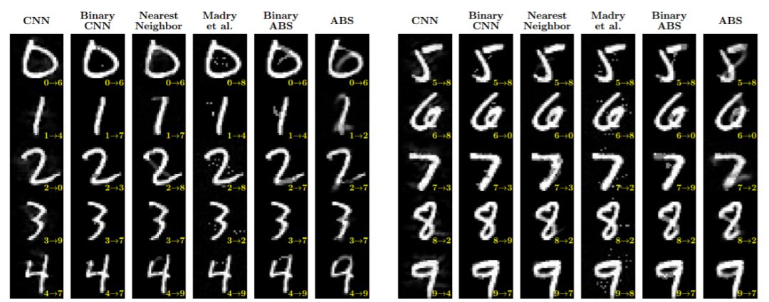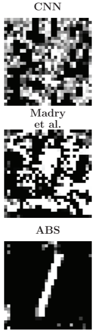 图 4:示例:CNN、Madry 方法和本文提出的 ABS 模型以超过 90% 准确率将图像分类为「1」。