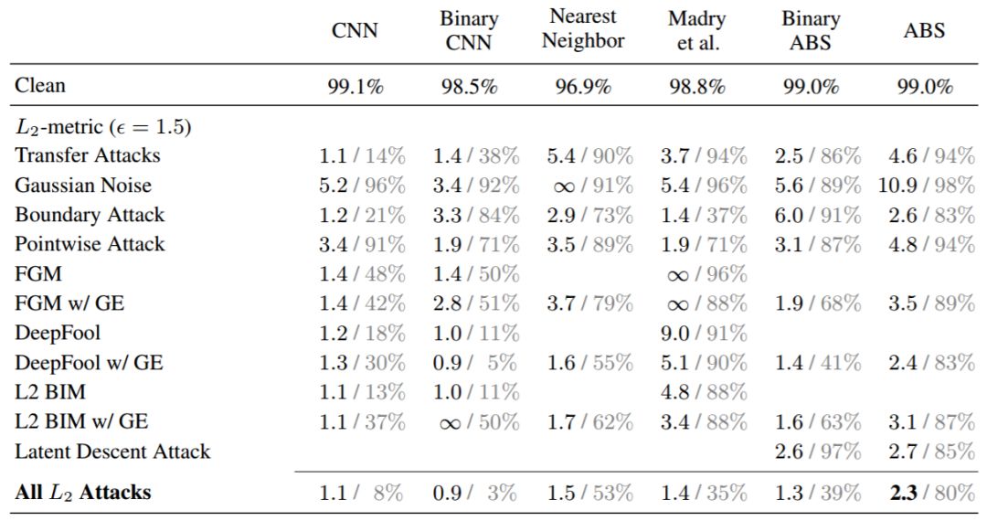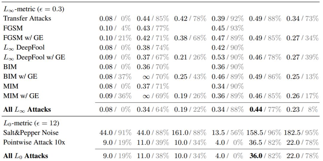 表 1:不同模型在不同对抗攻击和距离指标下的 MNIST 分类准确率结果。每一项展示了所有样本的中位数对抗距离(左值,黑体),以及模型在对抗扰动阈值(L_2 = 1.5、L_∞ = 0.3、L_0 = 12)下的分类准确率(右值,灰体)。「w/ GE」表示使用了数值梯度估计的攻击。