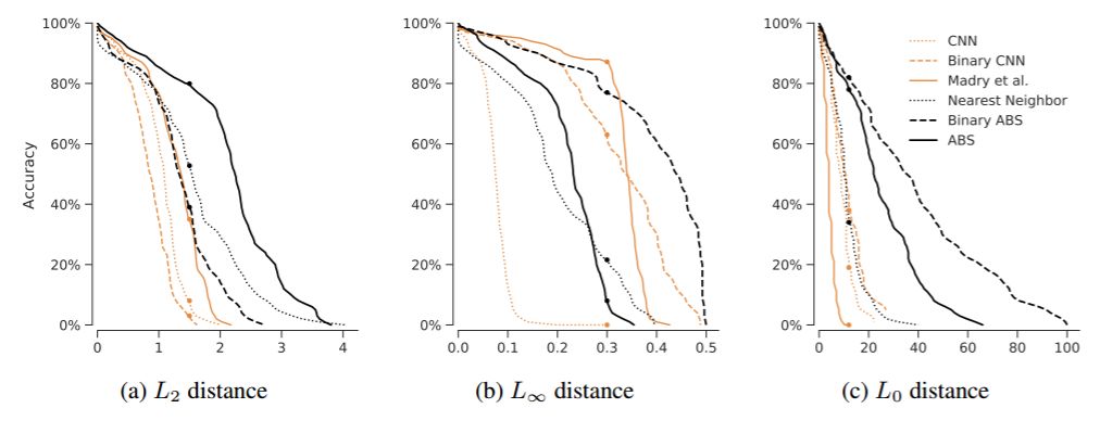 对每个模型和 L_p 范数,我们展示了随着对抗扰动尺度增加模型准确率降低的表现,如图 2 所示。在图(b)中我们能看到 Madry 等人的方法在 L_∞距离=0.3 的阈值内有很好的表现,而 Binary ABS 能达到 0.5 的阈值。