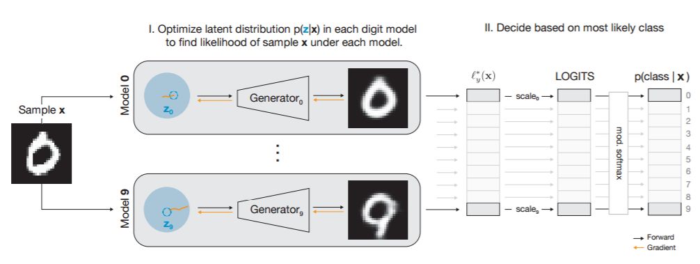 作者在本文中探索的潜在解决方案受到了不可识别图像或远端对抗(distal adversarials)的启发。远端对抗是和训练图像不相似,看起来像噪声,但仍以高信度被模型分类的图像。看起来似乎很难在前馈网络中防御此类图像,因为我们对于远超出训练领域的输入如何被分类很难进行控制。相对地,生成模型可以学习输入的分布,并因此可以度量其分类信度。通过在每个类别中额外地学习图像分布,我们可以检查输入展示的图像特征如何影响分类结果(例如,公交车的图像应该包含真实的公交车特征)。按照这种信息论的思路,我们可以想到著名的贝叶斯分类器概念。在本文中,作者介绍了一种基于变分自编码器的微调变体,其在实现高准确率的同时能保证鲁棒性。
