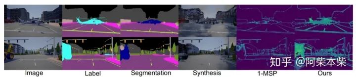 与故障检测一样,首先在训练图像上训练一个cGAN生成器G,它使用分割对象标签来合成图像。给定一个语义分割模型M,我们得到其预测yˆ = M (x)和获取的合成图像xˆ = G(yˆ)。由于yˆ中只包含了给定的类别,所以xˆ也只包含了给定的类别。因此xˆ与x会差别很大。所以将x与xˆ再次输入M中时,M最后一层所提取的特征也会有很大的差别。作者用余弦距离作为指标来定义x与xˆ在M最后一层特征上的差异: