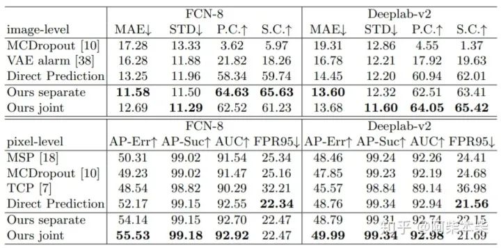 表1:在Cityscapes数据集上的实验。我们在FCN-8和Deeplab-v2的分割结果中进行失败检测。“Ours separate”和““Ours joint”意味着分别训练我们网络中的图像级和像素级故障检测头。