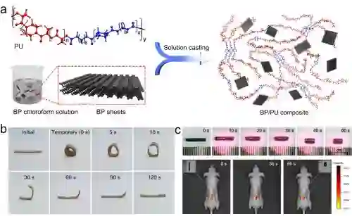 a,黑磷/聚氨酯复合物的制备过程;b,黑磷/聚氨酯复合膜光致形变行为展示;c,黑磷/聚氨酯复合柱在体外和体内的光致形变行为展示。