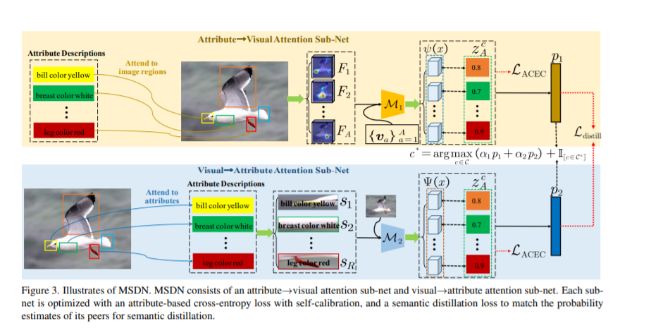 零样本学习(zero-shot learning, ZSL)的关键挑战是如何推断已见类的视觉特征和属性特征之间的潜在语义知识,从而实现对未见类的知识迁移。以往的研究要么简单地将图像的整体特征与其关联的类语义向量对齐,要么利用单向注意学习有限的潜在语义表示,无法有效地发现视觉特征与属性特征之间的内在语义知识(如属性语义)。为了解决上述困境,我们提出了一种相互语义蒸馏网络(MSDN),该网络逐步提取ZSL的视觉特征和属性特征之间的内在语义表示。MSDN包含学习基于属性的视觉特征的属性→视觉注意子网和学习基于可视化的属性特征的属性→属性注意子网。通过进一步引入语义蒸馏损失,两个相互关注的子网络能够在整个训练过程中进行协作学习和相互教学。提议的MSDN在强大的基线上产生了显著的改进,导致在三个流行的具有挑战性的基准(即CUB、SUN和AWA2)上产生了新的最先进的性能。我们的代码已在:\url{https://github.com/shiming-chen/MSDN}。