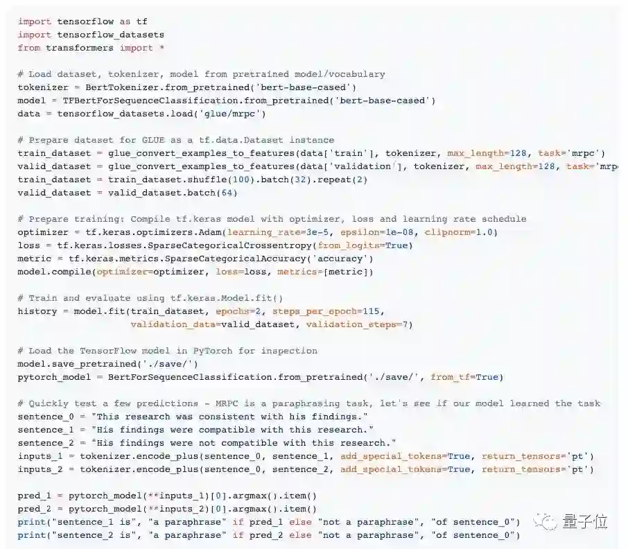 在GitHub项目中,他们也当场演示了如何用12行代码训练TensorFlow 2.0模型,然后将其放到PyTorch进行快速检测和测试: