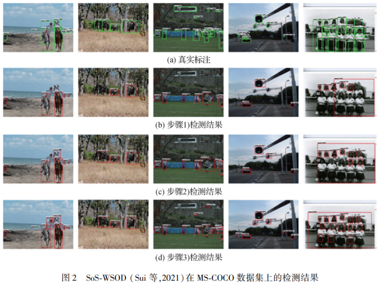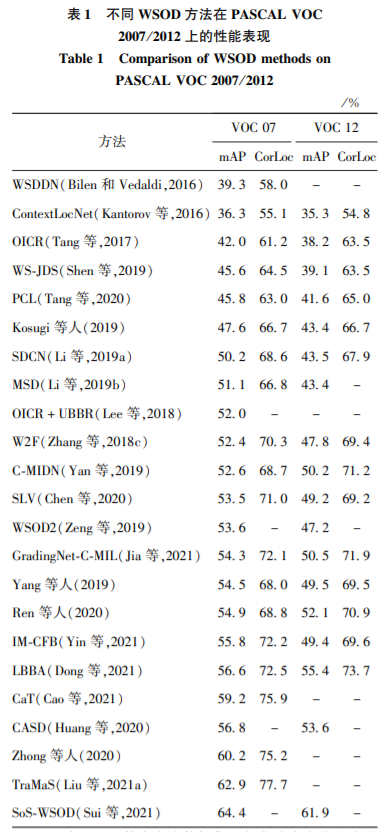 1)存在的问题和挑战。相对于全监督学习,视觉弱监督学习由于仅依靠弱标注,因而会面临局部聚焦,难以准确地挖掘出所有的物体和精确地定位物体。如何进一步缩小视觉弱监督学习与全监督学习的性能差异,并将其进一步应用于实际的视觉理解应用,仍然是未来视觉弱监督学习研究中亟待解决的问题。另外,当视觉弱监督学习应用于开放动态环境时,标注噪声和异常样本往往难以避免。如何利用开放环境的大量未标注数据或噪声数据,并有效抑制异常样本的不利影响,是视觉弱监督学习研究走向应用的过程中亟待解决的挑战。此外,弱监督学习并不是降低标注成本的唯一方式。视觉弱监督学习如何在与其他低标注成本学习方式的竞争中脱颖而出,或者结合其他方式形成更为有效的低标注成本学习解决方案,仍然是一个值得深入研究的问题。
