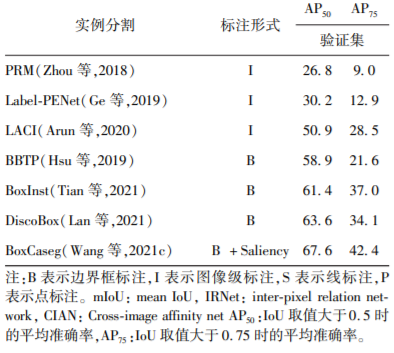 2)视觉弱监督学习的发展趋势。模型性能的提升不仅依赖于视觉弱监督学习方法自身的进步,还需要考虑与现有数据集、任务和模型的结合问题。例如,受益于大规模预训练模型,利用知识迁移和蒸馏等方式将辅助数据集或更大的开放数据集的知识用以提升视觉弱监督学习性能。在目标检测与语义分割方向,已有工作尝试引入全监督辅助数据集,在保证辅助数据集与弱监督数据集无重合类别的情况下,通过知识蒸馏与迁移学习方法,借助辅助数据集上的知识来提升弱标注数据集上检测与分割的性能。近年来开始出现的CLIP 等视觉—语言大规模预训练模型也可以视为一种重要的知识来源,有助于大幅提升视觉弱监督学习性能。对于大量未标注样本,自监督学习已经开始展现出良好的学习和泛化性能,因而也有望与弱监督学习有机结合以取得更高的性能。此外,检测和分割任务具有较强的相关性,不同学习任务的结合也有望为提升弱监督学习性能提供新的研究思路。